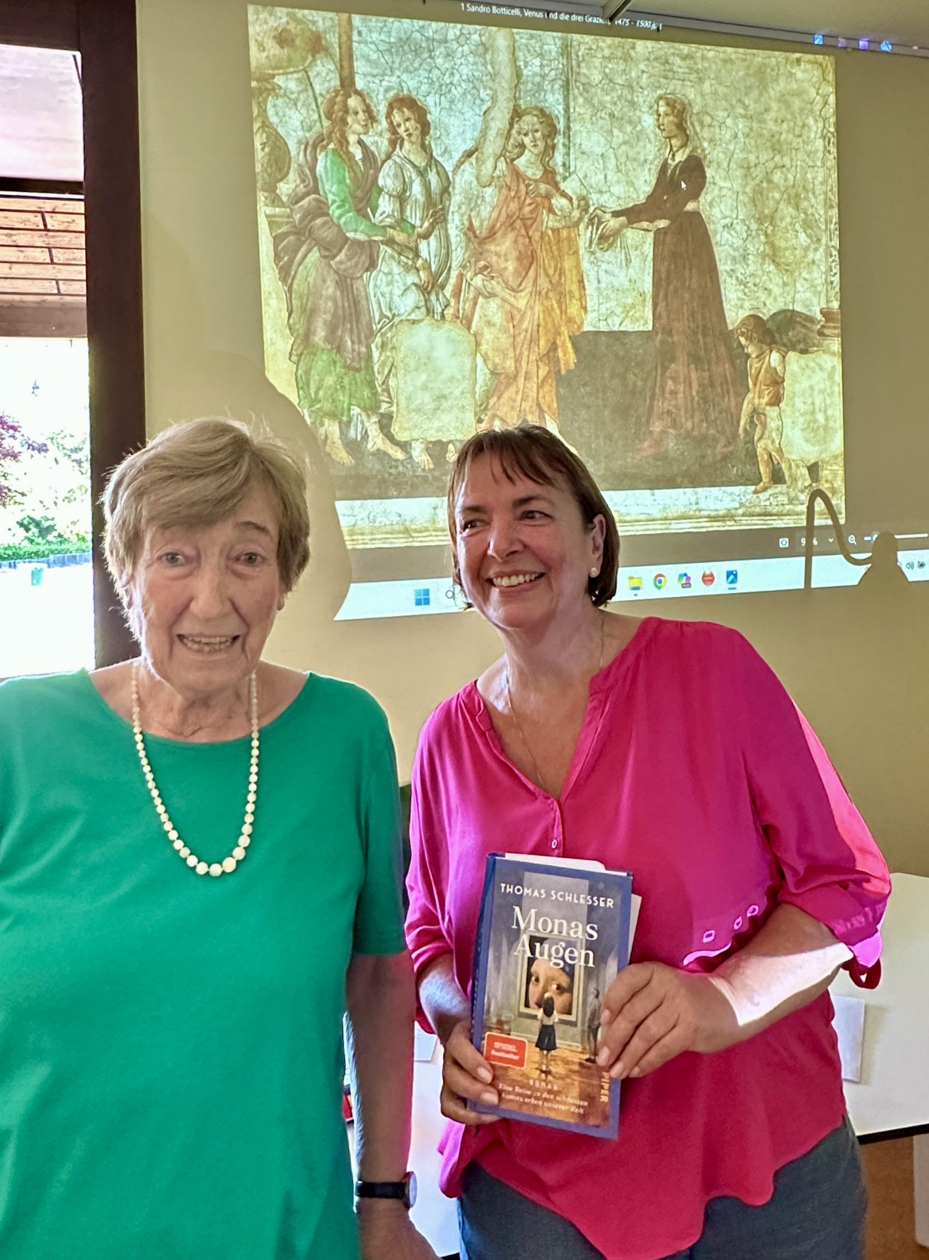 “Wieder ein voll besetztes Lesecafé”, freuten sich Doris Fröleke und Martina Kahsnitz kurz vor ihrer Lesung am 19.08.25. Sie stellten den Roman “Monas Augen” von Thomas Schlesser vor. Dazu hatten sie fünf Kunstwerke aus dem Buch ausgewählt, die mit Hilfe eines Beamers an einer Wand visualisiert und im Text angesprochen wurden.